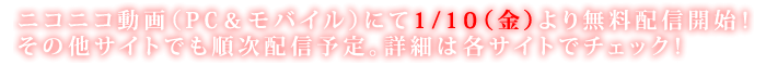 あにてれしあたー GyaO!(最新各話、配信後1週間無料) GyaO!ストア(第2話以降有料) DMM.com J:COM オン デマンド auひかり TVサービス(ビデオ・チャンネル) 楽天ショウタイム バンダイチャンネル |